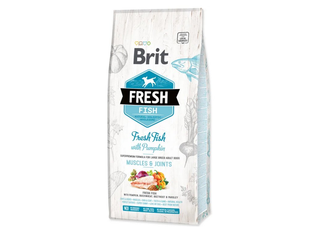 Brit Fresh Fish with Pumpkin Adult Large Muscles & Joints. Čerstvá ryba s tekvicou, pohánkou, červenou repou a petržlenovou vňaťou. Superprémiové krmivo pre dospelých psov veľkých plemien. Kompletné krmivo pre psov