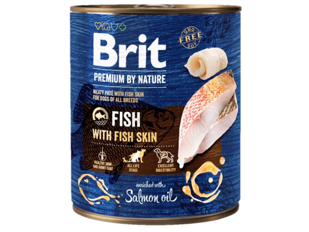 Brit prémiové vlhké krmivo pre dospelé psy s mäsom a kožami z rýb.