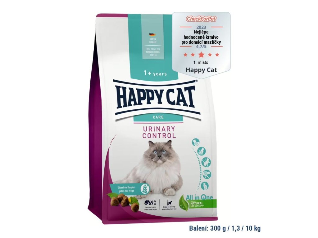 Granule Happy Cat Care Urinary Control obsahuje znížené množstvo minerálov, ako je vápnik, fosfor a horčík, to chráni močové cesty citlivých mačiek..69 % živočíšnych bielkovín (z celkového množstva bielkovín).Recept bez pšenice a lepku.Obsahuje glukosamín, ktorý podporuje sliznicu močového mechúra.Obohatené o púpavu a žihľavu.Od 1 roku veku