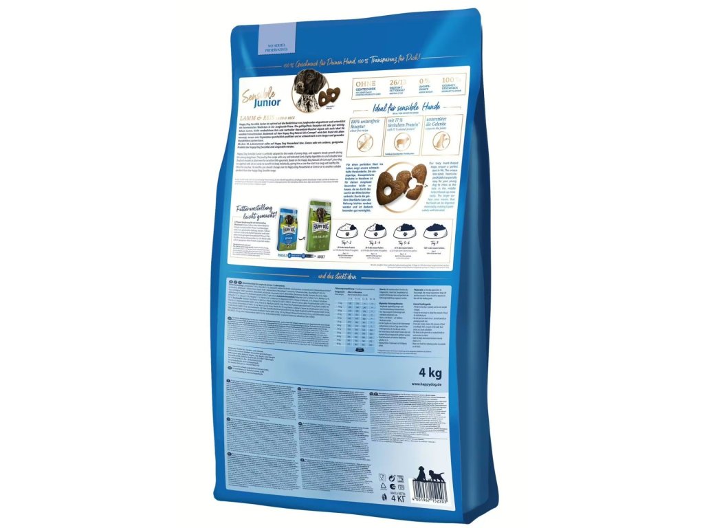 Receptúra suchého krmiva Happy Dog Sensible Junior Lamb & Rice neobsahuje lepok, hydinu ani zemiaky. Jahňacie mäso bohaté na bielkoviny je doplnené ľahko stráviteľnou ryžou, novozélandskými mušľami pre pevné kĺby a cennými bylinkami. Vďaka ľahko stráviteľným zložkám je toto krmivo vhodné aj pre citlivých mladých psov. Náš holistický prístup k vysoko kvalitnému psiemu krmivu Happy Dog taktiež zaisťuje, že váš pes dostane všetko, čo potrebuje pre zdravý rast primerane jeho veku.