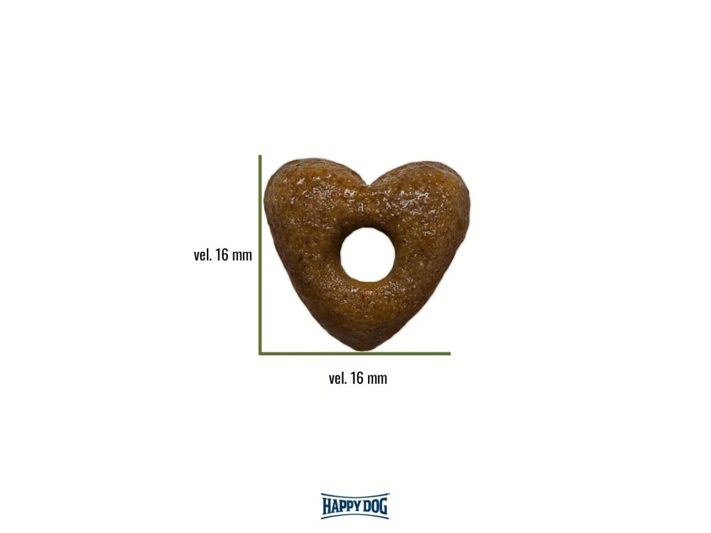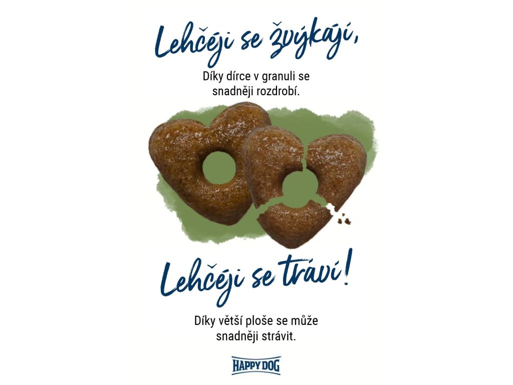 Granule všetkých našich Young produktov sú vyrobené v tvare srdca a majú uprostred dierku. Cieľom je, aby naše krmivo pre mladých psov bolo ľahko stráviteľné. Dierka znamená, že pri príjme sa granule rýchlejšie rozdrobia a váš pes ich môže ľahšie žuť. Vďaka väčšiemu povrchu granuly môžu tráviace šťavy potravu v žalúdku tiež lepšie rozložiť.