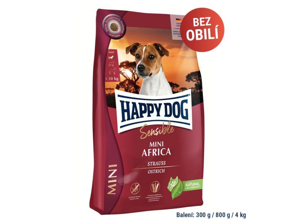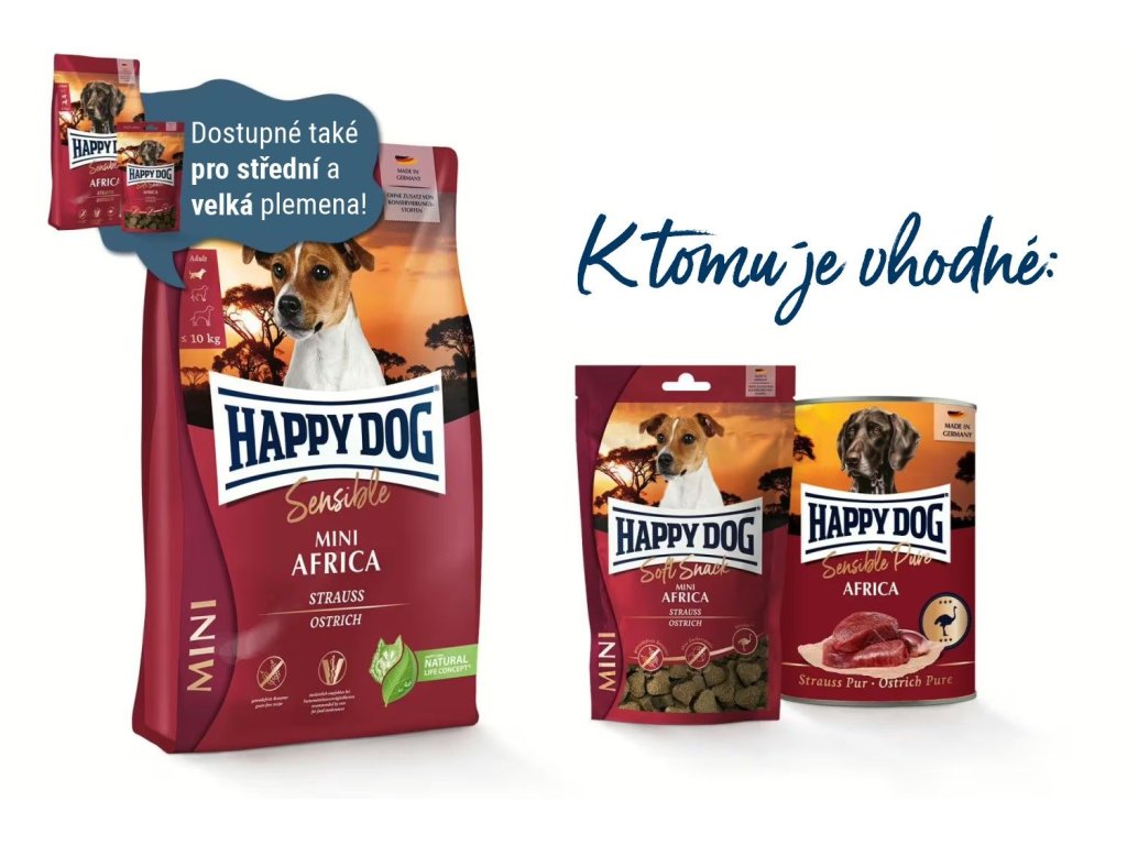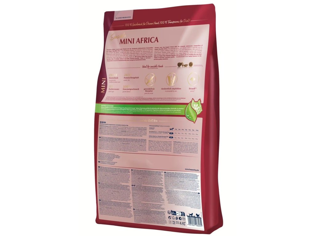 Výnimočne chutné superprémiové kompletné krmivo Happy Dog Sensible Mini Africa je ideálne aj pre všetkých náročných, dospelých gurmánov s dospelou hmotnosťou do 10 kg, ktorí vyžadujú pestrú zmenu alebo sú veľmi prieberčiví.