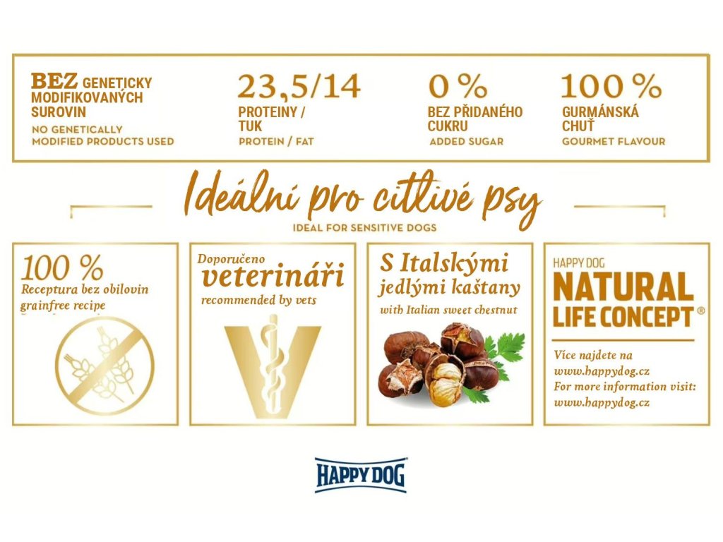 Hypoalergénne krmivo Happy Dog Sensible Piemonte s netradičnými talianskymi jedlými gaštanmi vášmu štvornohému priateľovi nielen výborne chutí. Ale vďaka bezlepkovej receptúre bez obilnín a bez zemiakov sú tieto suché hypoalergénne granule ideálne aj pre psy s potravinovou intoleranciou alebo alergiou. Receptúru tvorí vysoko stráviteľná kačica, lahodné oceánske ryby a ďalšie ingrediencie vďaka prídavku nášho jedinečného Natural Life Concept®. Tieto starostlivo vybrané komponenty a obzvlášť šetrný výrobný proces robia z krmiva Happy Dog Sensible Piemonte ideálne krmivo pre cieľavedomú diétu aj pre psov so špeciálnymi potrebami. Granule sú optimálne prispôsobené chrupu stredných a veľkých plemien psov. Aby bol metabolizmus vášho psa optimálne podporovaný druhovo zodpovedajúcim spôsobom, používame iba prírodné ingrediencie, z ktorých organizmus vášho psa holisticky profituje: ľanové semienko, vybrané druhy byliniek, jablká a novozélandské morské mušle.