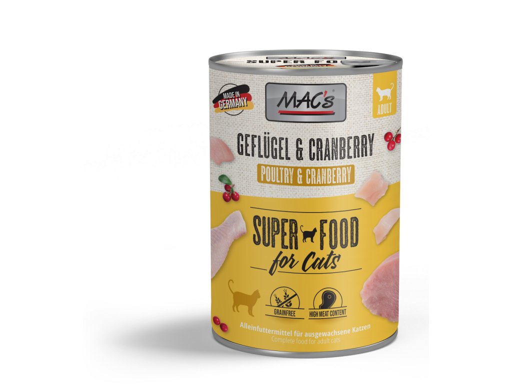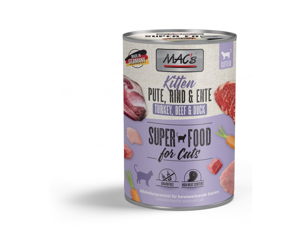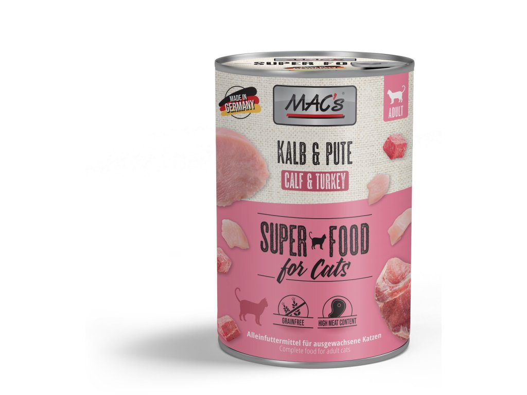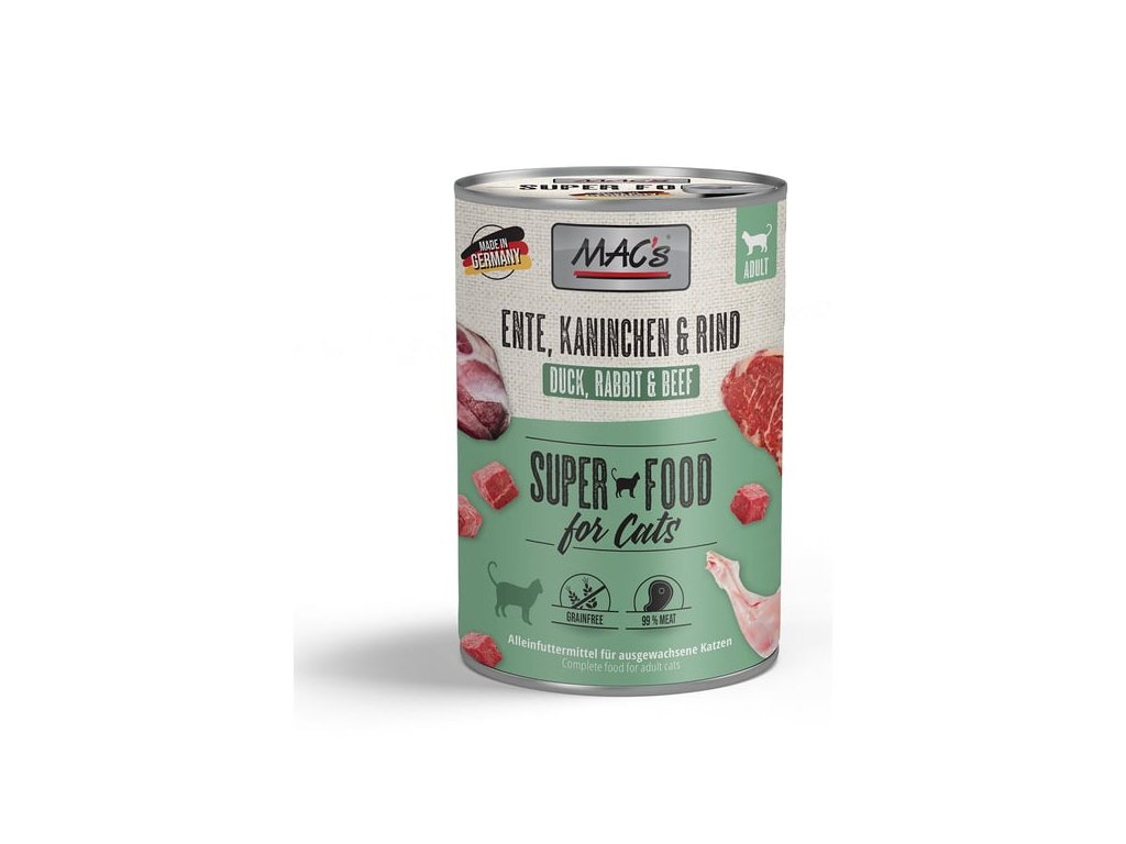 MAC's Cat je chutné mokré krmivo pre mačky, ktoré vyniká starostlivo vybranými zložkami a šetrnou prípravou. Krmivo sa vyrába v Nemecku a obsahuje vysoký podiel mäsa a vnútorností, a preto je ideálnou druhovo vhodnou stravou bohatou na živočíšne bielkoviny. Formované mäso a mäsokostnú múčku v krmive nenájdete. Krmivo je aj úplne bez obsahu obilnín a sóje.