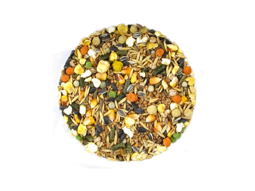 Kompletné krmivo pre králiky. Zloženie ovos obyčajný, jačmeň, kukurica, pšenica, kardi, extrudované kukuričné guličky farebné, trávové pelety, pšeničné otruby, lucernové granule, slnečnicový šrot, cukrovarské rezky, sladový kvet, triticale, žitné otruby, melasa, uhličitan vápenatý, chlorid sodný. Návod na správne použitie: Podáva sa podľa potreby, v suchom stave všetkým druhom králikov. Zabezpečte dostatočné množstvo čerstvej vody do napájačky. Skladovanie: na suchom mieste.
