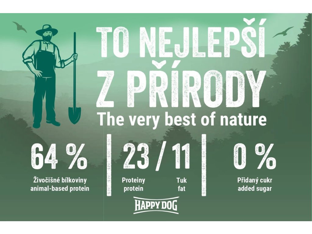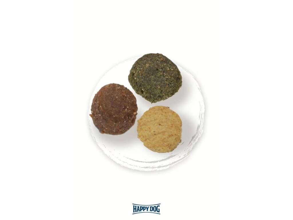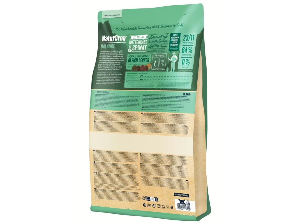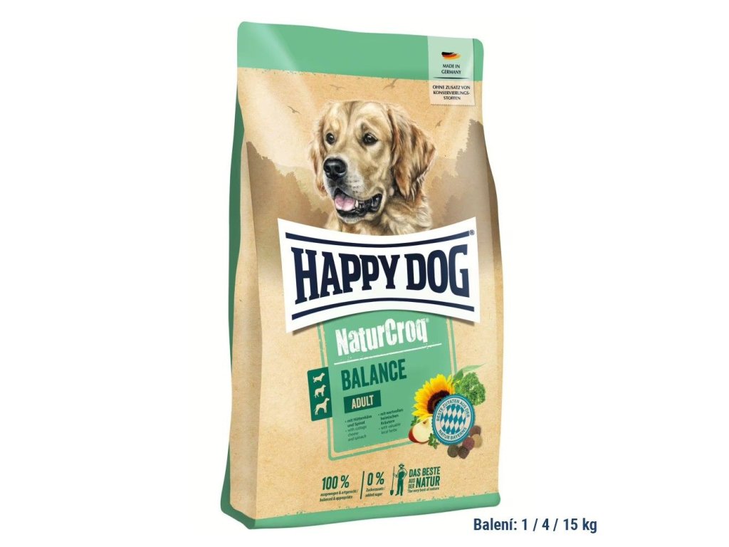 Pestrá zmes mäsových granúl s najlepšími ingredienciami z bavorskej prírody bola špeciálne vyvinutá pre dospelých psov s normálnou potrebou energie. Ponúka 64 % živočíšnych proteínov (z celkového obsahu proteínov) a pestrú skladbu vysoko kvalitných bielkovín z hydiny, hovädzieho mäsa, rýb, tvarohu a droždia. Toto plnohodnotné kompletné krmivo je obohatené o tvaroh, špenát, červenú repu, mrkvu a droždie a tým môže pozitívne podporovať trávenie a funkciu čriev. Preto je vhodnou šetrnou výživou aj pre citlivých psov. Celozrnné obilniny (ovos, jačmeň, ryža, kukurica, pšenica) sú cenným zdrojom vlákniny. Regulujú činnosť čriev, dodávajú pocit sýtosti, podporujú zdravé trávenie. Poskytujú tiež mnoho vitamínov skupiny B, minerálne látky ako je horčík, železo, selén a zinok a sú plné komplexných sacharidov. Veľmi chutná receptúra obsahuje cenné miestne bylinky, ktoré taktiež podporujú trávenie. Krmivo Happy Dog NaturCroq Balance je vyvážená a druhovo vhodná zmes granúl, ktorá ponúka veľmi zvláštny chuťový zážitok pre všetkých dospelých, normálne aktívnych psov.