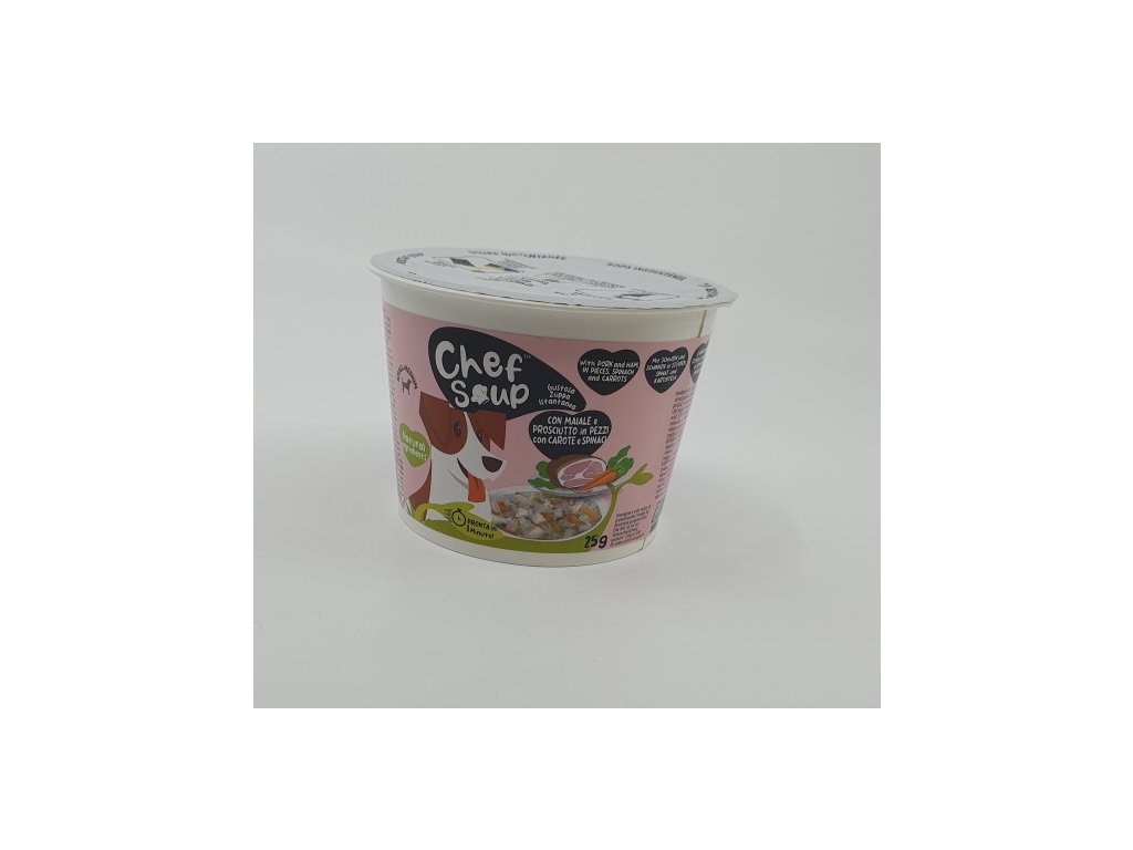Instantná polievka polievka pre psy Bravčové, kúsky šunky, špenát a mrkva, 25g.
