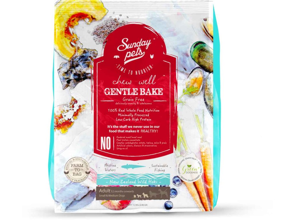SUNDAY PETS GENTLE BAKE GRAIN WILD HOKI je kompletné šetrne pečené krmivo vhodné pre dospelé psy malých a stredných plemien od 1roku veku. Obsahuje voľne žijúceho Hoki z Nového Zélandu. Krmivo bez obilnín, bohaté na proteíny a s nízkym obsahom sacharidov. Unikátny tvar CHEW WELL prispieva k pomalšiemu kŕmeniu a tým zlepšuje trávenie.