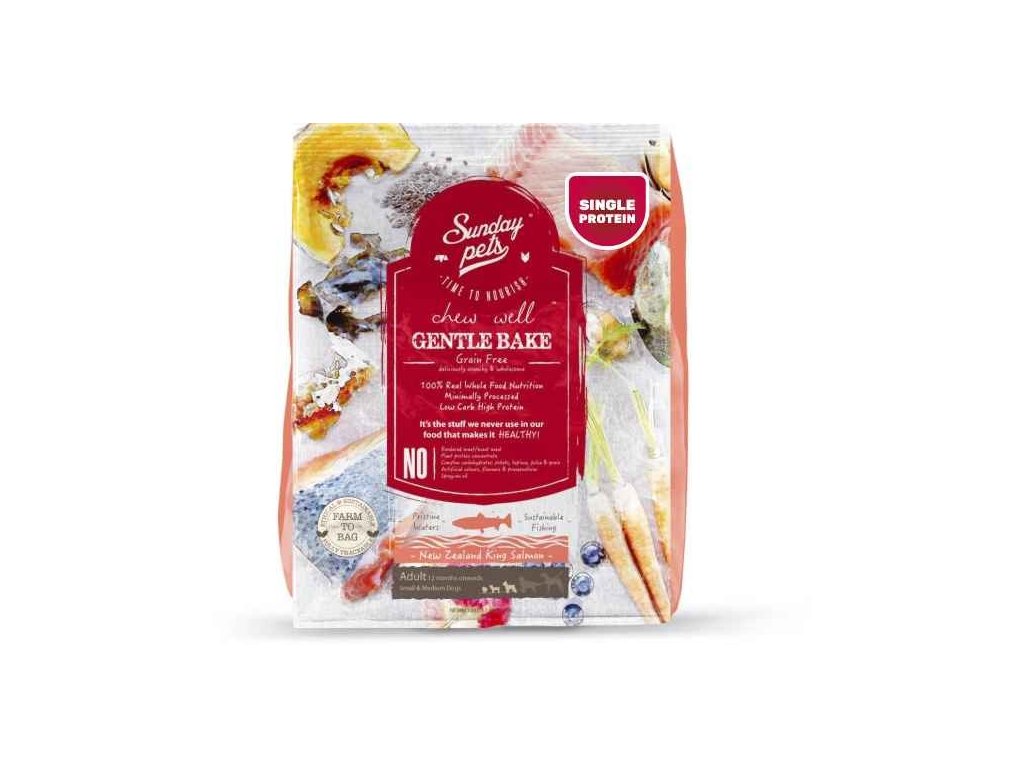SUNDAY PETS GENTLE BAKE GRAIN FREE SALMON je kompletné šetrne pečené krmivo vhodné pre dospelé psy malých a stredných plemien od 1roku veku. Obsahuje lososa kráľovského z Nového Zélandu. Krmivo bez obilnín, bohaté na proteíny a s nízkym obsahom sacharidov. Unikátny tvar CHEW WELL prispieva k pomalšiemu kŕmeniu a tým zlepšuje trávenie.